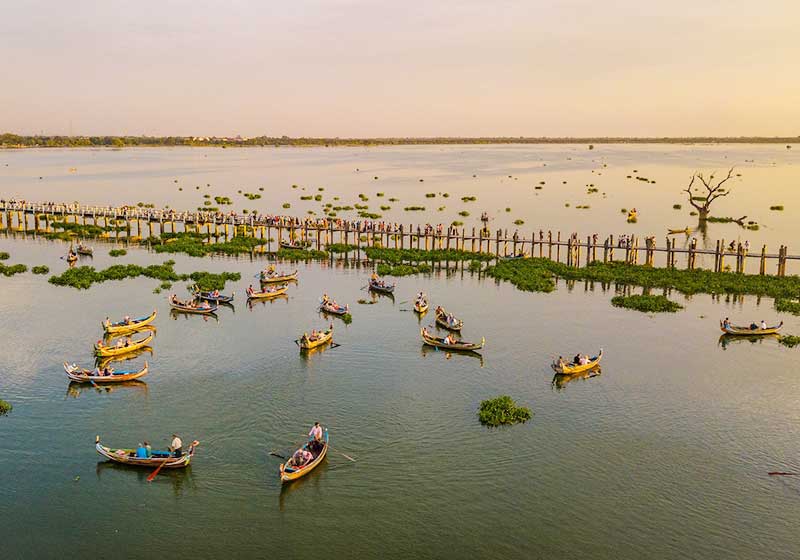 Hoy haremos una excursión a los alrededores de Mandalay. Visitaremos Amarapura, Ava y Sagaing. En Amarapura podemos explorar las fábricas de tejido y U Bein (un puente de madera). Después iremos a Ava, que fue la capital desde el siglo XIV al XVIII. Aquí haremos el tradicional paseo a caballo y carruaje hacia el viejo monasterio de madera Bagaya y los restos del Palacio Real y el fuerte de la ciudad. Después de comer cruzaremos el puente sobre el río Irrawaddy hacia Sagaing. Aquí pararemos para ver pagodas y monasterios, que incluyen la pagoda Swan Oo Pon Nya Shin y U Min Thone Sae. Al anochecer pasaremos por el puente U bein, para contemplar las impresionantes vistas. Noche en Mandalay.