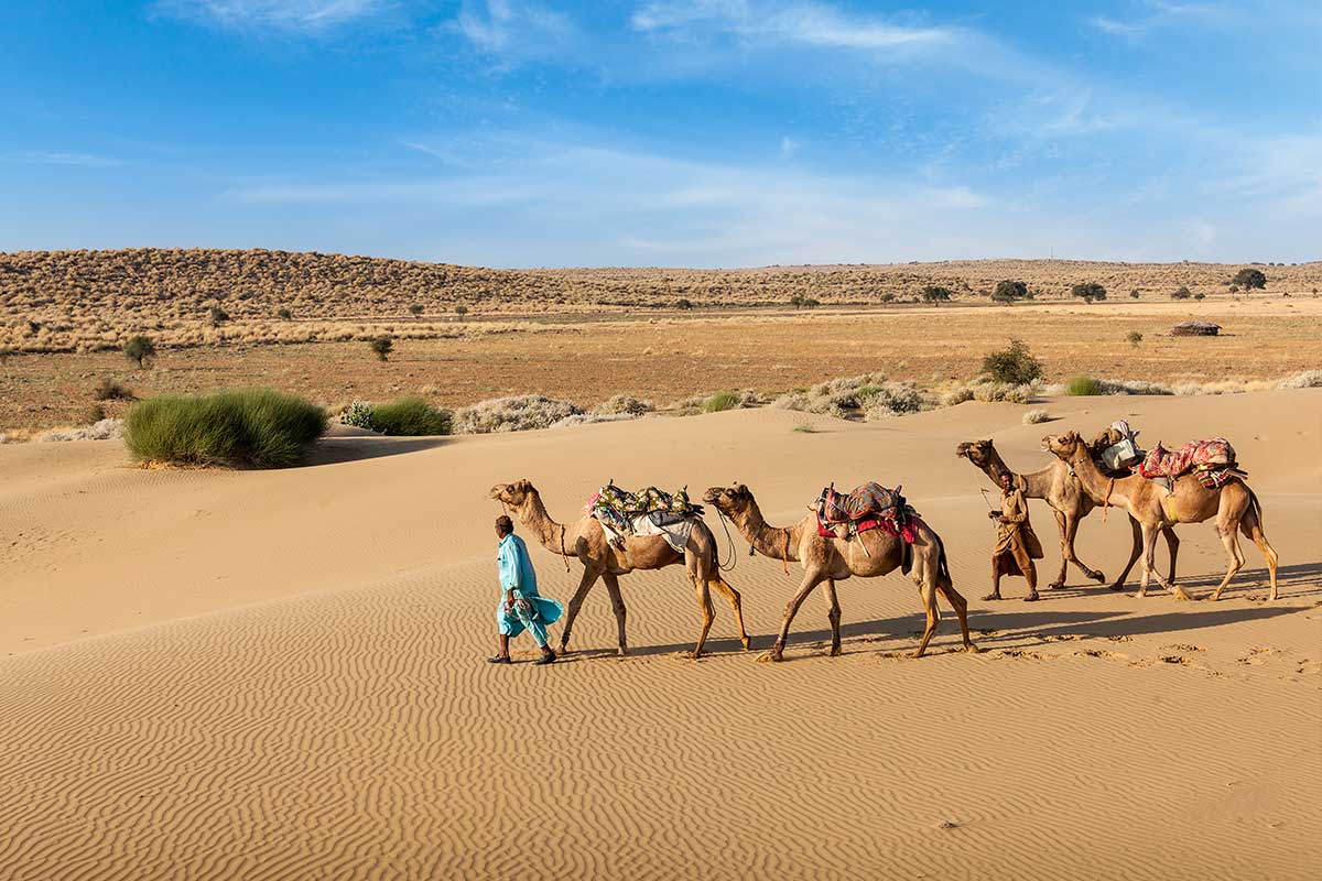 Por la mañana visitaremos las havelis o casas de comerciantes más majestuosas de la ciudad. Luego haremos un tour por la ciudad que incluye el increíble Fuerte de Jaisalmer, el lago Gadisar, un gran lago natural, los templos jainistas, la Patwon – ki – haveli y Nathmalji – ki – haveli. Por la tarde visitaremos las Dunas de Arena y daremos un paseo en camello para presenciar el atardecer en el desierto de Thar. Noche en Jaisalmer.