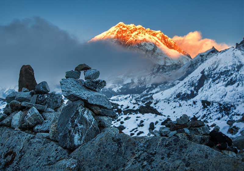 Continuaremos el trekking más arriba de la pequeña cresta y luego alrededor de la base del glaciar Khumbu, para tener un almuerzo en Dhugla (4600m). Desde aquí realizarás una corta y empinada subida hasta la morrena terminal del glaciar, desde donde las vistas son impresionantes. Alojamiento en Laubuche (4930m).