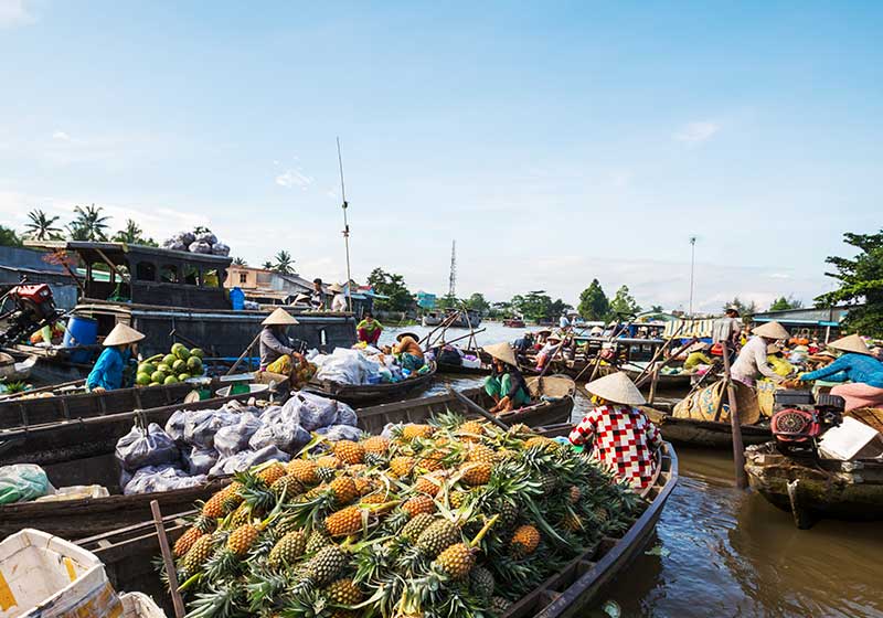 El sur de Vietnam tiene un clima tropical cálido, en contraste al clima lluvioso del norte. La gastronomía de este país puede considerarse fácilmente como una de las más deliciosas, con arroz como acompañante de la mayoría de las comidas. El pescado fresco se encuentra en cantidades gracias a la abundancia de agua. Una de las comidas por excelencia aquí incluye un plato de arroz y vegetales cocinados en una salsa fermentada. Las personas demuestran que están disfrutando de una comida haciendo mucho ruido a la hora de comer. Disfruta de un plato tradicional con los lugareños, sentándote en un tapete en el suelo.